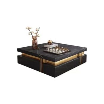 The Modern Square Storage Coffee Table is a refined composition that blends geometric clarity with functional elegance. Its square silhouette offers a generous surface area, topped with black marble or granite for natural texture and polished sophistication. The two-tier design features a lower base with four concealed wood drawers, each fitted with classic ring pulls and accented in gold for a touch of glamour. A central gold band adds visual rhythm and contrast, while the clean lines and layered structure evoke contemporary refinement. With ample storage and sculptural presence, this piece serves as a graceful focal point for living rooms, salons, or curated interiors.
