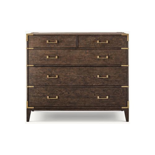 The Campaign-Inspired Chest with Brass Hardware pays homage to classic travel furniture while embracing a clean, modern sensibility. Its dark wood finish—possibly a deep stain—offers richness and warmth, while brass corner brackets and recessed drawer pulls introduce durability and timeless elegance. The silhouette is streamlined and functional, with five drawers arranged vertically for ample storage. Ideal for bedrooms, dressing areas, or transitional interiors, this piece blends heritage detailing with contemporary restraint.