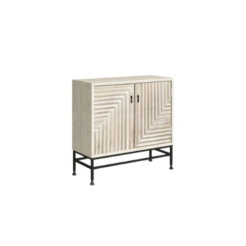 The Geometric Carved Transitional Accent Cabinet is a tall, textural storage piece that blends modern clarity with traditional craftsmanship. Its doors feature geometric carved panels that introduce depth and rhythm, while a light finish—possibly whitewashed or pale wood—enhances its airy appeal. Black metal handles offer functional contrast, and the slender black metal base adds a contemporary lift. Designed for versatile cabinet storage, this piece suits a variety of interiors, from living rooms and dining areas to bedrooms and entryways. With its transitional style and sculptural detailing, it serves as both a practical organizer and a refined statement.