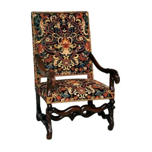 • Intricate tapestry upholstery with woven historical or natural motifs