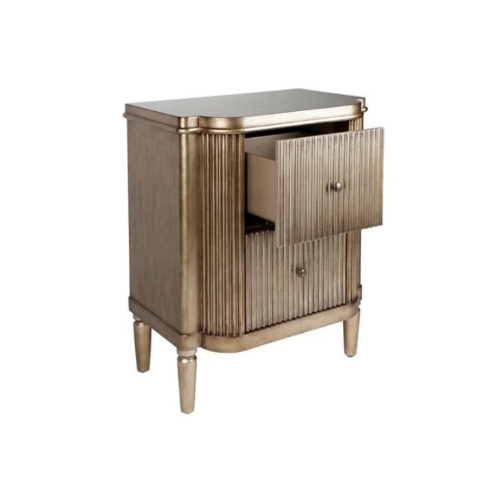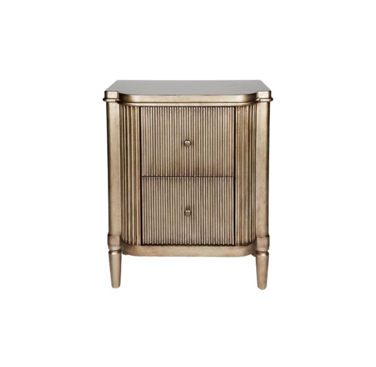 The Art Deco Inspired Two-Drawer Nightstand brings vintage glamour and sculptural elegance to your bedroom. Finished in champagne gold or antique silver, this piece features distinctive ribbed detailing across its drawer fronts and sides, paired with a sleek geometric silhouette and tapered legs. Two drawers with minimalist pulls offer practical storage, while the overall design evokes the sophistication of Hollywood Regency and Art Deco interiors.