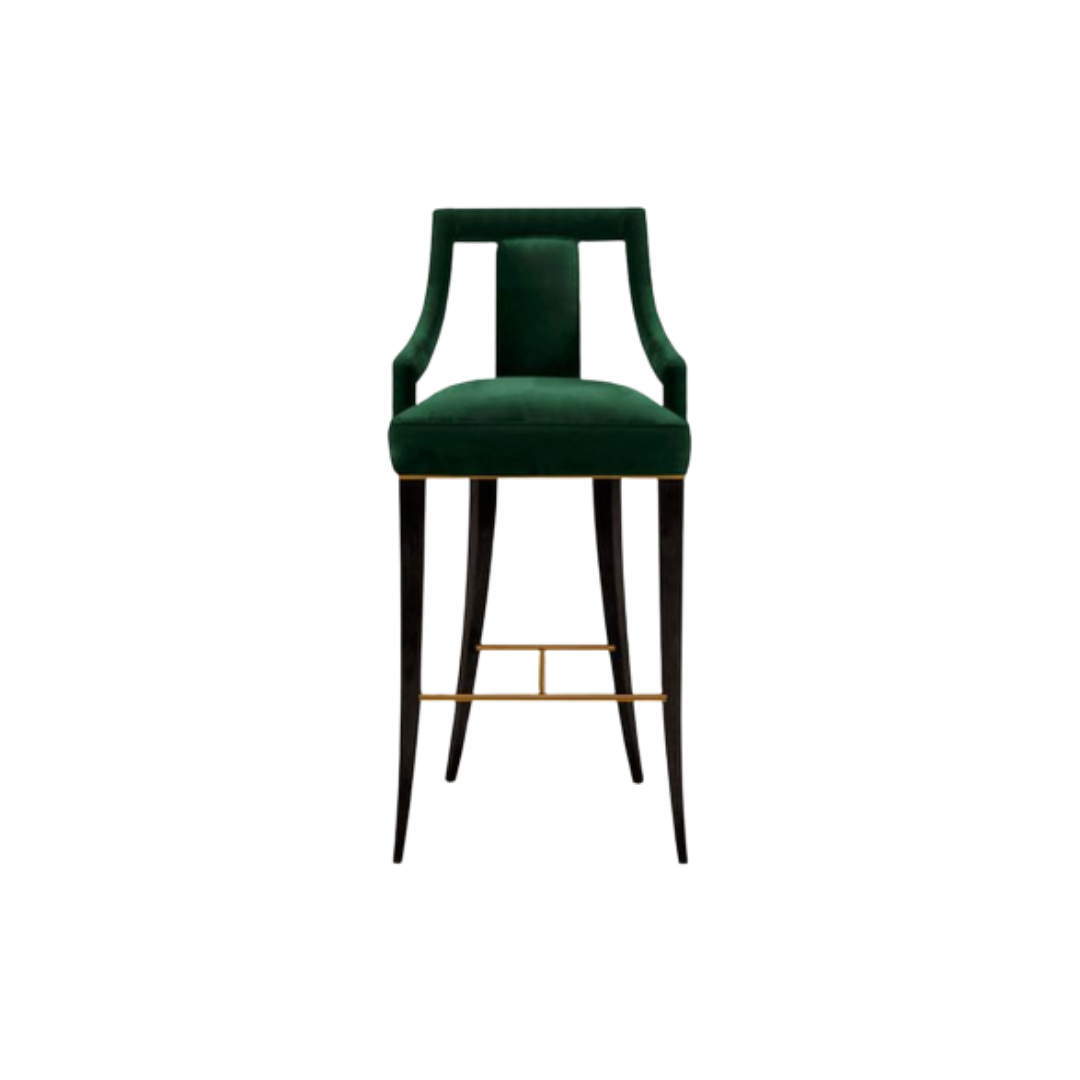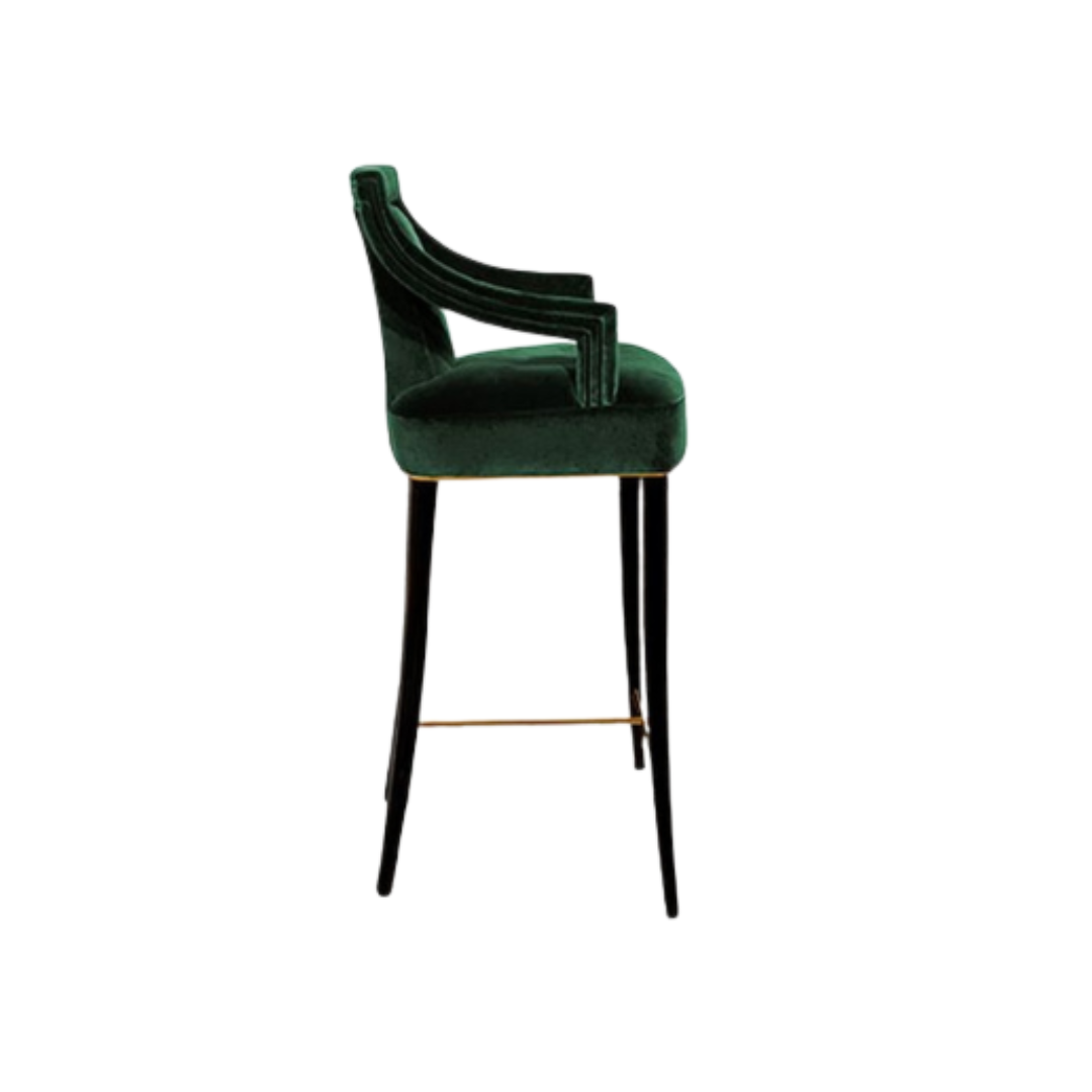 The Emerald Velvet Geometric Back Barstool is a sculptural seating piece that blends bold geometry with plush comfort. Upholstered in rich emerald green velvet or performance fabric, the seat and backrest offer a soft, inviting texture. A cut-out center framed by geometric shapes creates a visually striking silhouette, while the curved backrest and armrests provide ergonomic support. Dark-stained wood legs ensure durability and warmth, complemented by a brass footrest ring that adds elegance and contrast. Designed for bar counters or high tables, this barstool embodies the glamour and symmetry of Art Deco interiors with a contemporary twist.
