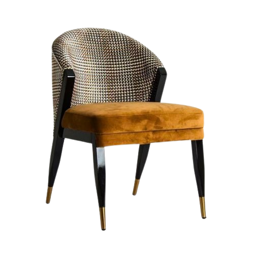 The Barrel Back Accent Chair is a tailored composition that blends classic patterning with modern elegance. Its curved silhouette offers supportive comfort, upholstered in a striking combination of houndstooth fabric and velvet—creating a dynamic interplay of texture and tone. The seat invites relaxation with its plush velvet surface, while the black lacquered legs provide a sleek foundation. Gold metal caps at the base add a subtle touch of glamour and protect flooring with refined detail. With its sculptural form and contrasting materials, this piece serves as a sophisticated accent for living rooms, dressing areas, or curated interiors.