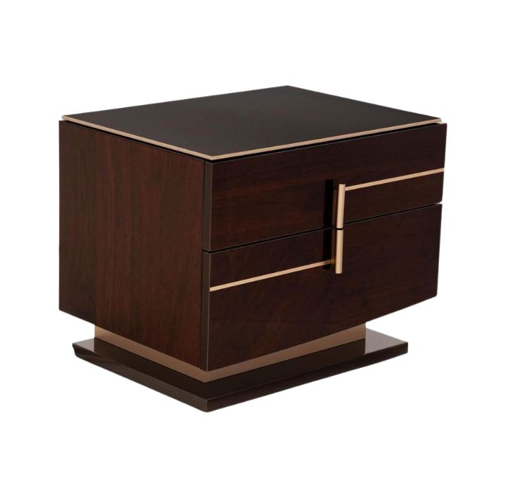 The Bellagio Nightstand captures the essence of modern Italian design with its sleek geometry and luxurious finishes. A high-gloss Macassar Ebony veneer creates dramatic depth, while the contrasting glass top and elegant metal trim—available in gold or chrome tones—add refined brilliance. Two drawers offer discreet storage, and the recessed or platform base enhances its sculptural presence.