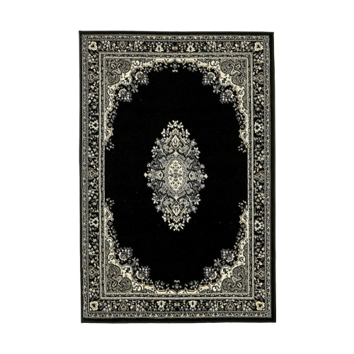 The Black Persian-Style Rectangular Rug is a refined textile piece that blends traditional elegance with monochromatic sophistication. A central medallion in cream and gray anchors the design, surrounded by floral and geometric motifs that radiate outward in perfect symmetry. The black background offers dramatic contrast, enhancing the intricacy of the pattern and lending a sense of depth and formality. Framed by an ornate border of repeating decorative elements, this rug is ideal for formal living rooms, curated interiors, or spaces seeking a touch of heritage and grace.