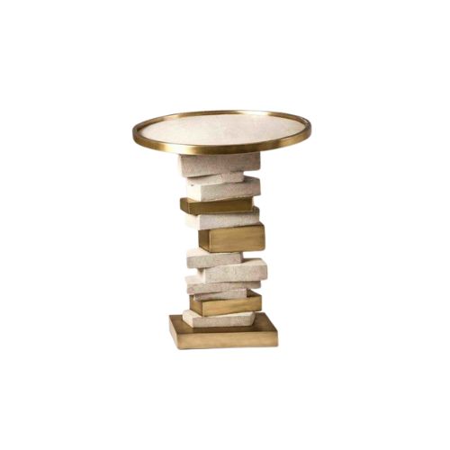 The Bullion Accent Table is a luxurious composition of sculptural form and rich material contrast. Its stacked base alternates between stone and gold bullion-like segments, creating a rhythmic structure with tactile depth. The round top features a light-toned surface framed by a gleaming gold rim, offering a refined counterpoint to the textured base.