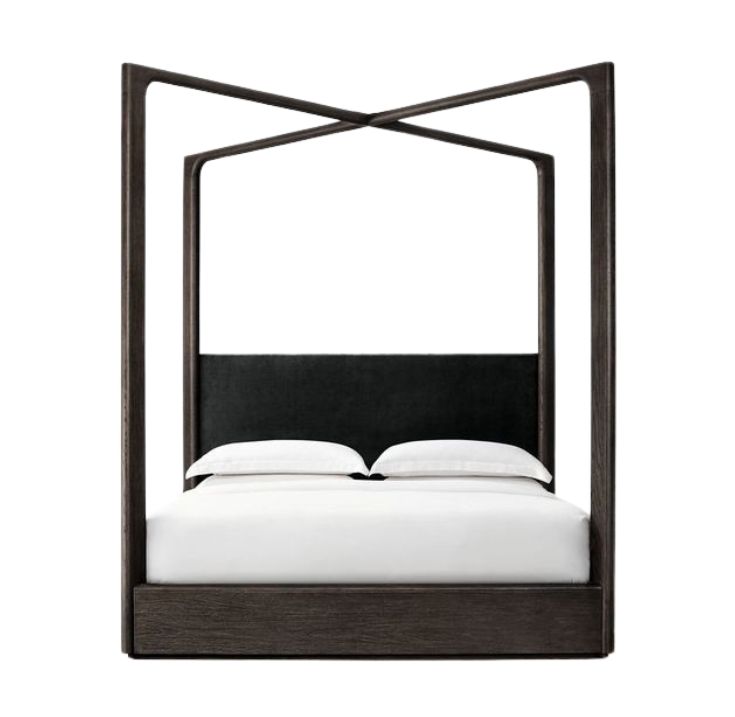 The Oslo Panel Platform Canopy Bed is a bold reinterpretation of classic canopy design, tailored for modern living. Its clean lines and geometric silhouette create a striking architectural presence, while the rich walnut-stained oak frame adds warmth and depth. A plush charcoal velvet headboard introduces softness and comfort, balancing the structure’s sleek form. The open canopy invites personal styling—whether adorned with flowing drapes or left minimalist for a refined, contemporary look.