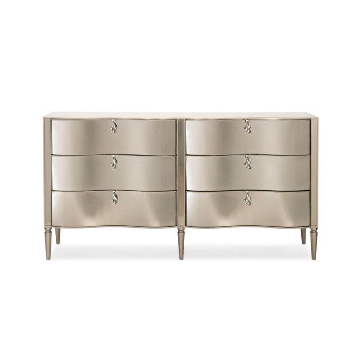 The Classic Wonder-Full Dresser by Caracole exudes timeless elegance with its sophisticated silhouette and glamorous detailing. Finished in soft silver or champagne tones, this piece features six spacious drawers adorned with unique decorative pulls—likely in brushed nickel or antique silver—that add a refined touch. The gently curved front enhances its graceful presence, while tapered or cabriole legs provide both support and sculptural charm. Designed to elevate traditional, French-inspired, or transitional interiors, this dresser offers generous storage and a luxurious focal point for bedrooms or dressing areas.