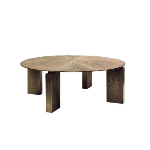 The Carmel Coffee Table is a sculptural composition that blends modern elegance with tactile richness. Its round top features a radial pattern in textured metal—suggesting bronze or antique brass—offering depth, shimmer, and visual rhythm. The base, composed of four distinct legs in matching metallic finish, adds architectural clarity and grounded sophistication.