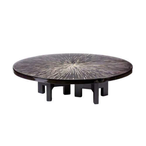 The Round Coffee Table is a sculptural composition that celebrates natural materials and artisanal detail. Its circular silhouette promotes conversation and spatial harmony, crowned with a petrified wood top featuring a distinctive radial pattern that reveals the organic beauty of fossilized grain. Intricate inlay work—suggesting pewter or brass—traces the surface with luminous contrast, while the dark lacquered base introduces geometric structure and visual grounding. With its expressive form and refined finishes, this piece evokes quiet luxury and artistic clarity, making it a dramatic focal point for living rooms, salons, or curated interiors.