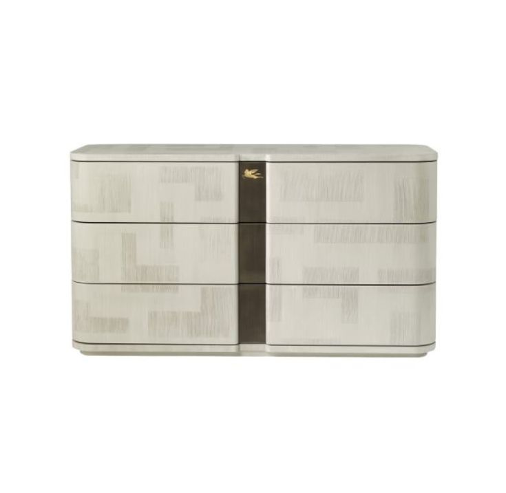 The Galet Dresser by Giorgetti showcases a unique blend of organic forms and refined craftsmanship. Its gently curved silhouette and rounded edges evoke a sculptural softness, while the textured or smooth wood veneer finish—available in neutral tones such as beige, grey, or brown—adds warmth and sophistication. Four spacious drawers with distinctive recessed pulls are seamlessly integrated into the design, complemented by a contrasting wood or leather top and a plinth or leg base. This piece brings contemporary elegance and functional storage to bedrooms, dressing rooms, or curated living spaces.
