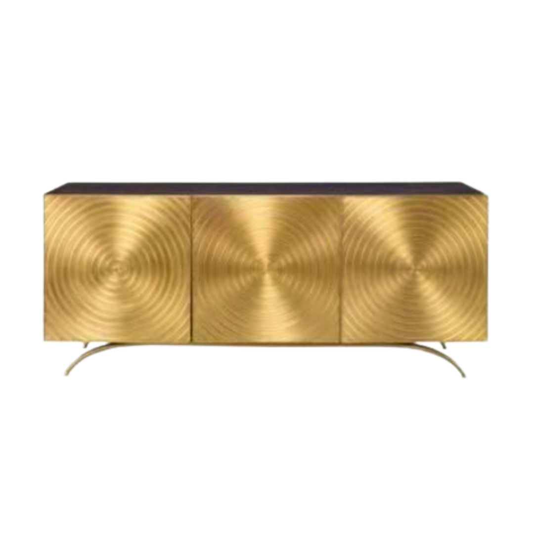 The Claudio Sideboard is a bold expression of contemporary elegance and artisanal detail. Its three doors feature textured metal surfaces with a radial pattern—suggested in brushed or hammered brass or bronze—creating a luminous and tactile façade. A contrasting top, possibly in dark stained wood or stone, adds depth and visual balance. Curved metal legs in matching brass or bronze tones provide sculptural support and a graceful silhouette. Designed for dining rooms, living spaces, or hallways, this sideboard offers generous concealed storage while serving as a striking focal point.