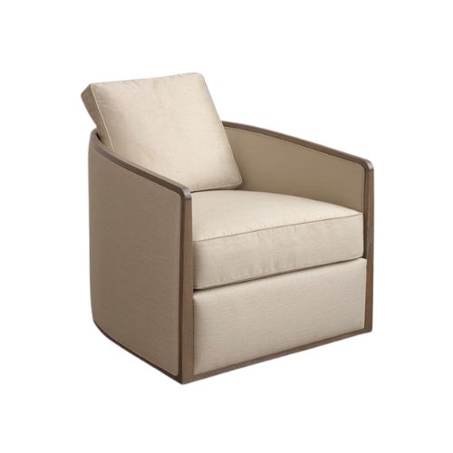 Its rounded silhouette is upholstered in light-toned linen or performance fabric, creating a clean, airy aesthetic. Deep, plush cushions and a loose back pillow provide enveloping comfort—like sinking into a cloud—while the swivel base adds versatility and ease. Crafted with high-end materials and thoughtful proportions, this chair is a refined accent for relaxed, contemporary interiors.