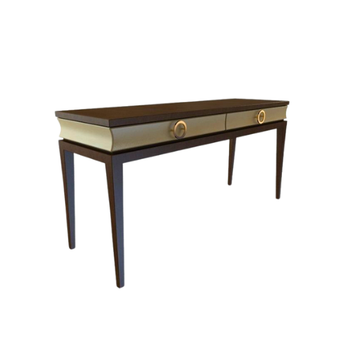 The Contemporary Console Table is a refined accent piece that blends minimalist design with functional elegance. Its two-tone finish—featuring a cream lacquer drawer front paired with a dark wood top and legs—creates a striking visual contrast. Round metal drawer pulls in brass or gold add a subtle touch of glamour and utility. Two drawers offer concealed storage for everyday essentials, while tapered legs lend lightness and sophistication. Designed for entryways, living rooms, or hallways, this console embodies modern style through clean lines and thoughtful detailing.