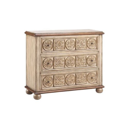 The Cream Carved Accent Chest blends traditional craftsmanship with contemporary versatility. Its soft cream finish offers a neutral foundation, while intricately carved door fronts—featuring medallions and geometric motifs—add texture and visual interest. Round metal hardware, possibly antique brass or bronze, introduces warmth and functionality. Ball feet provide classic support and elegance. With three drawers for storage, this piece is ideal for bedrooms, living rooms, or entryways seeking a timeless and transitional accent.