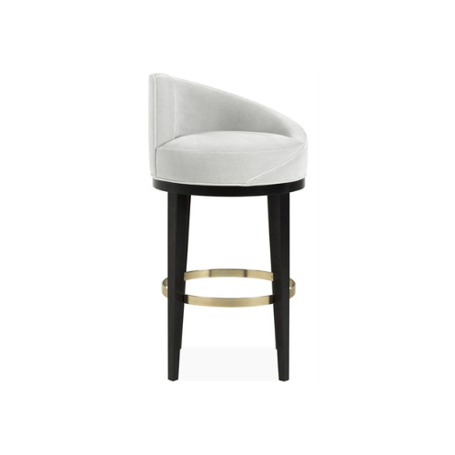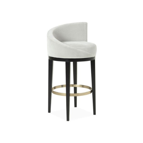 The Crescent Back Barstool offers a sculptural silhouette and luxurious comfort, making it a refined addition to elevated interiors. Its crescent-shaped backrest creates a graceful curve, while the upholstered seat and back—available in light-colored velvet or performance fabric—provide both softness and support. Dark-stained wood legs lend warmth and stability, and a brass footrest ring adds a touch of polished elegance. Designed for bar counters or high tables, this piece embodies modern sophistication with clean lines and rich materials.
