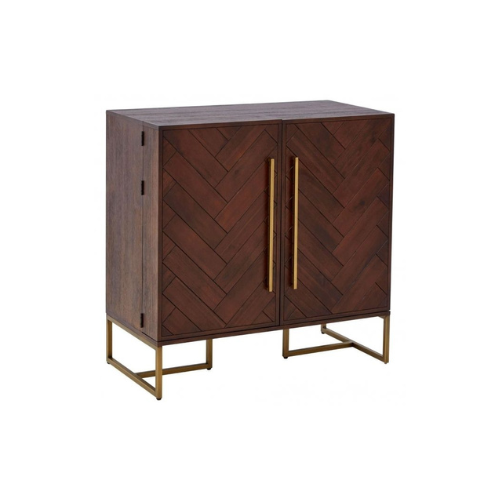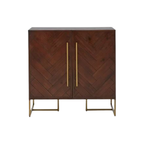 The Herringbone Drinks Cabinet is a sophisticated storage piece that blends geometric texture with warm elegance. Its two front doors feature a striking herringbone pattern, adding depth and visual rhythm to the design. Finished in rich brown wood, the cabinet exudes warmth and refinement, while gold handles and slender gold metal legs introduce a touch of glamour. Designed to organize drinks, barware, or everyday essentials, this cabinet offers concealed storage with a clean-lined silhouette. Ideal for living rooms, dining areas, or curated bar corners, it embodies modern style with a sculptural edge.
