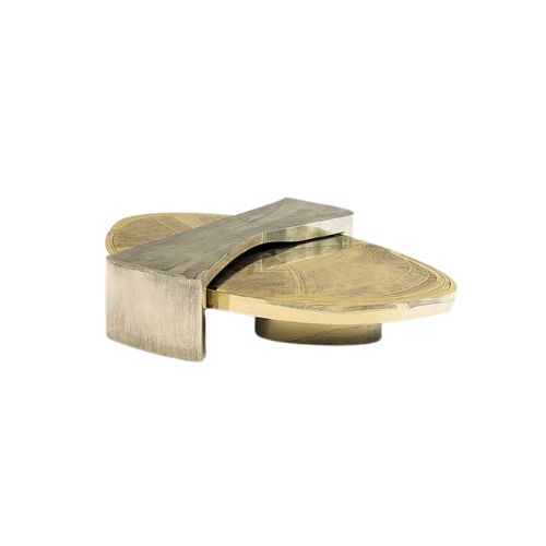 The Empreinte Coffee Table is a striking composition that blends artistic expression with sculptural clarity. Its interlocking silhouette features two organically shaped tiers—each with fluid contours and a dynamic spatial relationship—creating a layered, dimensional presence. Crafted in a cohesive metallic finish, with brushed brass and silver tones, the surface shimmers with texture and tonal depth. The free-form geometry evokes natural movement while maintaining architectural balance, making this piece a dramatic focal point for living rooms, salons, or curated interiors.