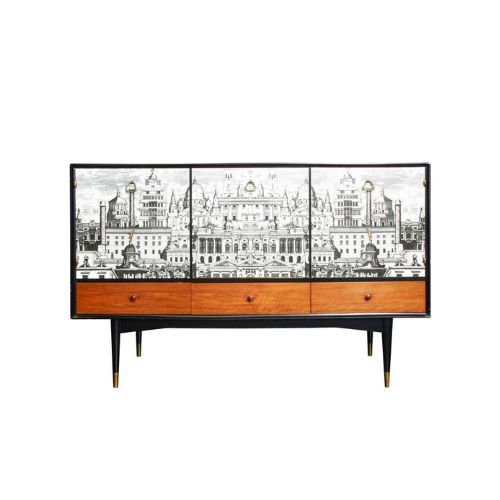 The Fornasetti Accent Cabinet is a theatrical sideboard that merges surreal artistry with mid-century modern structure. Its doors feature a prominent architectural illustration—likely hand-drawn or screen-printed—evoking classical, Renaissance, or fantastical buildings. Contrasting light wood drawers add warmth and tonal variation, while the black lacquered frame introduces drama and depth. Brass accents on the handles and legs elevate the piece with opulence and contrast. With three doors and three drawers, this cabinet offers generous storage while serving as a visual centerpiece.