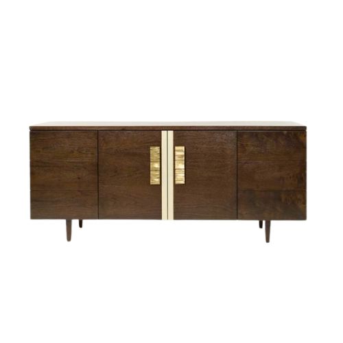 This four-door sideboard is a timeless storage solution that blends clean geometry with understated elegance. Crafted from solid wood—suggested in dark stained walnut or mahogany—it features a matte or satin finish that enhances the natural grain and adds depth to its silhouette. Contrasting handles, possibly in brass or gold-toned metal, introduce a subtle touch of glamour. Tapered legs and crisp lines define its mid-century modern profile, making it a striking focal point in dining rooms, living spaces, or hallways. Behind its sleek façade lies generous cabinet storage, ideal for organizing serveware, linens, or personal items.