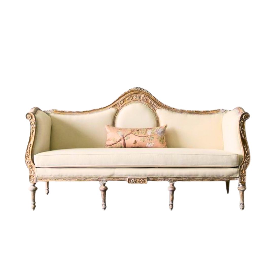 Inspired by classic French design, this piece features a gracefully curved silhouette with a hand-carved wooden frame in a light antique white or gilded finish. Upholstered in smooth, slightly lustrous ivory fabric—possibly silk—it offers a luxurious touch suited to formal interiors. Delicate nailhead accents and optional matching pillows complete the look, making this sofa a statement of enduring sophistication.