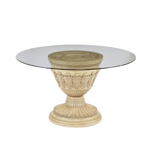 The Glass Top Foyer Accent Table is a classically styled centerpiece that brings refined elegance to entryways and transitional spaces. Its round glass tabletop offers a clear, open surface while allowing full visibility of the sculptural pedestal base below. The base is shaped like a decorative urn, meticulously carved with ornate detailing and finished in a light, subtly antiqued tone that evokes timeless character.