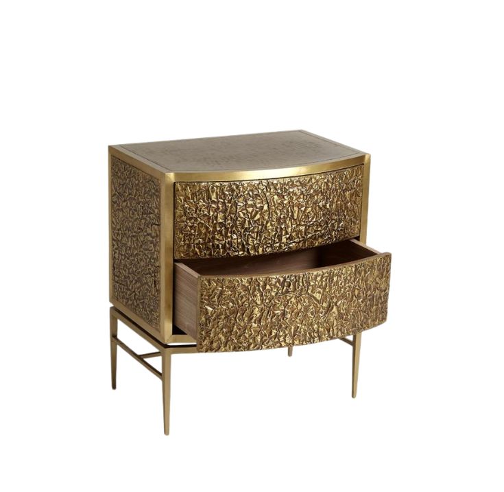 The Crinkle Bedside Chest by Global Views is a sculptural statement piece that brings bold texture and modern glamour to any bedroom. Its crinkled metal exterior—finished in antique gold or brass—creates a dynamic surface that catches the light beautifully. The curved silhouette adds softness, while sleek metal legs maintain a contemporary edge. With two drawers for storage, this chest balances artistry and function in a truly distinctive design.