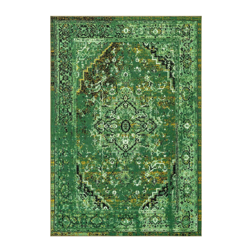 The Green Persian-Style Rectangular Rug is a richly detailed accent piece that celebrates traditional carpet artistry and symmetrical elegance. At its center lies a classic medallion motif, surrounded by floral and geometric patterns that radiate outward in perfect balance. The design is rendered in a layered palette of dark and light greens, black, white, and subtle yellow accents, creating depth and visual texture. Ornamental borders featuring vine and floral elements frame the composition, adding rhythm and refinement. Ideal for formal living rooms, entryways, or curated interiors, this rug brings cultural richness and timeless sophistication to any space.