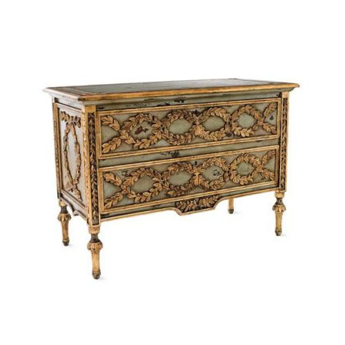 The Laurel Wreath Commode with Painted Finish is a refined accent piece that celebrates classical symbolism and artisanal craftsmanship. Its hand-carved laurel wreath motif—often accompanied by ribbons and decorative flourishes—evokes timeless elegance and honor. A distressed or antiqued painted finish in soft green or blue-grey tones, highlighted with gold accents, adds depth and a gently aged character. Round metal hardware in antique brass or bronze complements the palette, while tapered legs lend graceful support. With two drawers for storage, this commode is ideal for bedrooms, living rooms, or entryways seeking a sophisticated and ornamental touch.