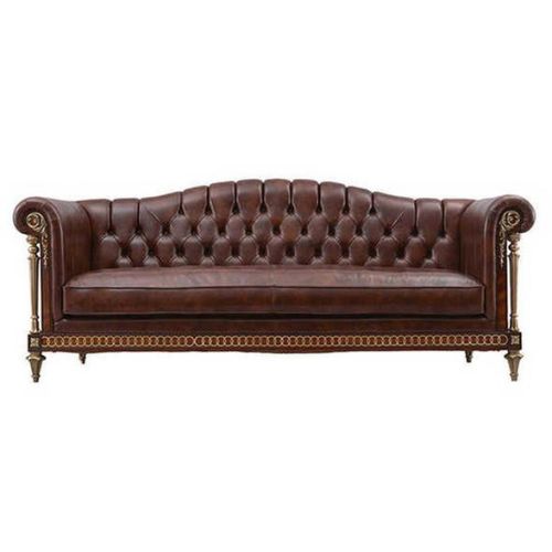 The Hand-Carved Chesterfield Sofa is a masterful composition that elevates the iconic Chesterfield silhouette with exquisite craftsmanship and ornamental depth. Upholstered in warm brown genuine leather, each piece reveals natural tonal variations and a lived-in patina that deepens with time. Its rolled arms, deep button tufting, and elegant low profile preserve the Chesterfield’s timeless character, while the hand-carved mahogany wood frame—finished with a rich, hand-rubbed polish—adds sculptural refinement. Decorative trim accents the base and arms, complementing the intricate carvings. Distinctive legs, more ornate than traditional designs and potentially featuring metal or contrasting material details, complete the profile with architectural lift and visual drama. Designed to anchor formal interiors, this sofa offers a sophisticated blend of classic comfort and distinctive artistry.