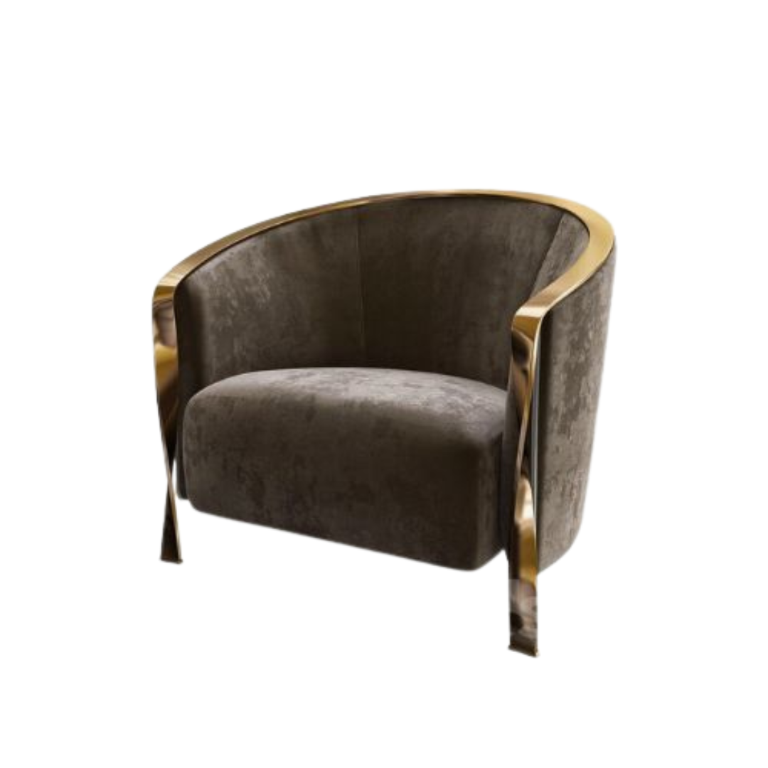 Its curved silhouette is upholstered in plush velvet, offering a soft, inviting seat with sculptural appeal. A gleaming gold or brass band encircles the base, adding a touch of contemporary glamour and visual contrast. Designed for comfort and crafted with high-end materials, this chair brings refined drama to any interior.