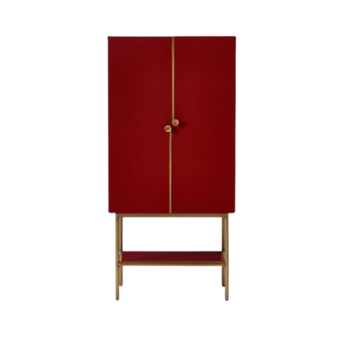 The Red Lacquer & Brass Bar Cabinet is a striking statement piece that celebrates bold color and luxurious detailing. Finished in vibrant red high-gloss lacquer, its sleek surface reflects light and energy, while polished brass accents—including trim, handles, and base—introduce a glamorous contrast. Double doors open to reveal ample storage for bottles, glassware, and bar essentials, while the open base with a lower shelf offers additional space for display or organization. With its clean lines, radiant materials, and mid-century modern influences, this cabinet elevates any living room, dining space, or curated bar area with dramatic flair.