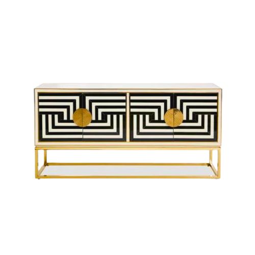 The Jonathan Accent Cabinet is a bold statement piece that channels modern glamour through geometric precision and high-gloss finishes. Its doors feature a graphic Harlequin pattern in black and white lacquer, creating a striking visual rhythm. Brass accents—including textured round handles and slender legs—add warmth, contrast, and opulence. Two concealed doors offer practical storage, while the open shelf base introduces lightness and display potential. Designed for living rooms, dining areas, or entryways, this cabinet brings Art Deco elegance and sculptural clarity to curated interiors.