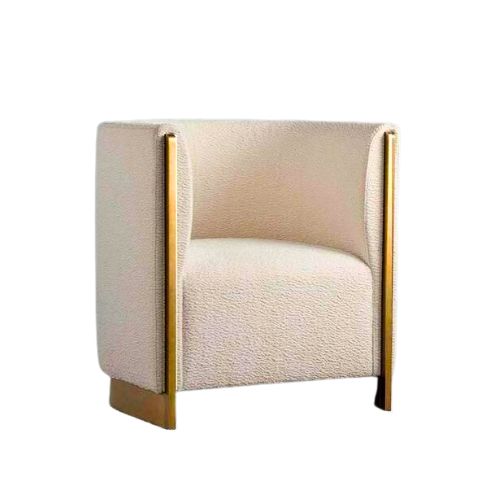 Its cube-shaped silhouette is upholstered in bouclé or textured fabric, offering a cozy yet elevated feel. The rounded back enhances comfort, while the contrasting metallic frame—available in gold or brass—adds a sleek, architectural edge. Designed for modern interiors, this chair brings chic sophistication to any space.