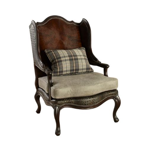 Its high back and prominent wings are upholstered in textured hair-on hide or embossed leather, creating visual depth and tactile interest. The seat features smooth, supple leather in a complementary tone, while hand-applied nailhead trim adds refined detail. A button-tufted back enhances the silhouette with classic texture, and gently rolled arms invite relaxed seating. The carved wood frame lends ornate character, and a decorative accent pillow completes the ensemble.