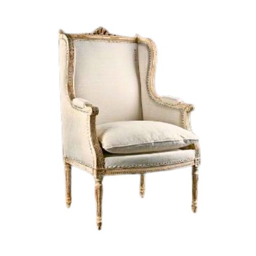 Designed with a high, slightly curved rectangular back and upholstered sides, this piece features gently scrolled arms and a loose seat cushion for relaxed comfort. The carved wood frame—often adorned with floral or leaf motifs—comes in a distressed white or natural finish, adding vintage charm and artisanal depth. Resting on classic cabriole legs, the chair may also exhibit subtle signs of age that enhance its antique character.