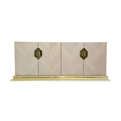 The Mastercraft Sideboard is a refined statement piece that blends mid-century modern elegance with Asian-inspired detailing. Its four doors feature parquetry panels in light-toned wood, forming a geometric pattern that adds rhythm and visual texture. A high-gloss or lacquered finish enhances the wood’s natural tone and depth. Brass hardware—suggested as stylized pulls or handles—introduces a touch of cultural sophistication, while the brass base grounds the piece with warmth and glamour. Designed for dining rooms, living spaces, or hallways, this sideboard offers generous concealed storage and serves as a sculptural focal point.