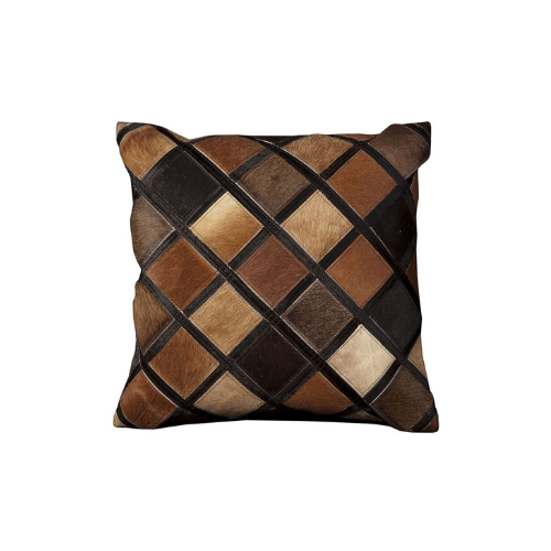 The Diamond-Pattern Cowhide Patchwork Pillow is a striking accent piece that celebrates natural texture and geometric craftsmanship. Made from genuine cowhide, the surface features a grid of diamond-shaped patches, each showcasing organic variations in tone and grain. The palette includes rich shades of brown, black, and tan, offering depth and warmth with no two pieces alike. Its standard square shape makes it ideal for layering across sofas, armchairs, or beds. Perfect for rustic, lodge-inspired, or masculine interiors, this pillow brings tactile richness and timeless character.