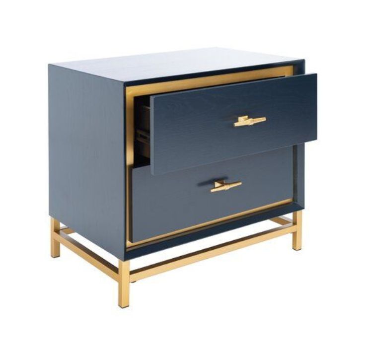 The Modern Two-Tone Nightstand with Gold Accents brings a glamorous edge to contemporary bedrooms. With its deep navy-blue finish and striking gold accents along the frame and drawer pulls, this piece offers a bold yet refined aesthetic. Two drawers provide practical bedside storage, while the clean lines and luxe contrast make it a standout addition to modern interiors.