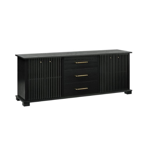 The Dark Wood Sideboard with Slatted Doors and Brass Hardware is a refined storage piece that blends modern clarity with transitional warmth. Crafted in dark-stained oak or ash with a wire-brushed or cerused finish, its surface reveals natural grain and depth. Slatted doors on either side introduce texture and rhythm, while three central drawers offer organized storage. Brass hardware—including drawer pulls and door handles—adds contrast and elegance, enhancing the piece’s sculptural appeal. A solid base with block feet grounds the design, offering stability and architectural presence. Ideal for living rooms, dining areas, or entryways, this sideboard serves as both a functional anchor and a sophisticated focal point.