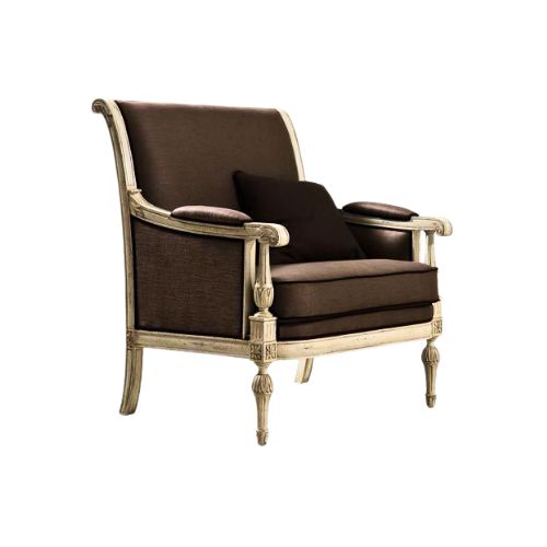 Defined by its flat-topped back—often adorned with a decorative cresting—and straight, geometric lines, this occasional chair offers timeless sophistication. Upholstered in light, neutral-toned velvet or silk with a subtle sheen, the surface exudes quiet luxury. Delicate wood carvings featuring beading, acanthus leaves, or rosettes highlight the frame’s craftsmanship, while decorative nailhead trim outlines the upholstery with tailored precision. Fluted or tapered legs, often finished with ornamental details, complete the silhouette with grace.