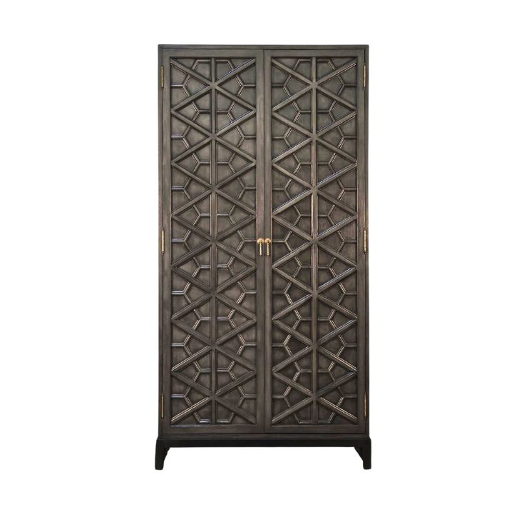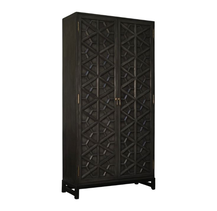 Its tall, boxy silhouette is finished in matte black and fronted by intricately patterned lattice doors—an interplay of diagonal and vertical lines that create depth and visual rhythm. Sleek metallic handles and short elevated legs complete the composition, offering both functionality and architectural presence. Designed for bedrooms, dressing areas, or studio spaces, this wardrobe brings quiet drama and modern elegance to curated interiors.