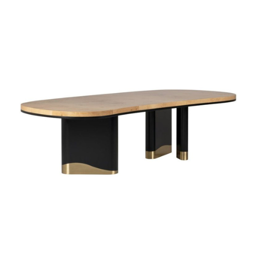 The Oval Dining Table with Sculptural Two-Tone Base is a refined centerpiece that blends contemporary artistry with functional elegance. Its oval tabletop—suggested in light-toned wood veneer with a matte or satin finish—offers a spacious and inviting surface that encourages conversation and connection. The base features a two-tone composition: black lacquered wood paired with brass or gold-toned metal accents, creating visual contrast and modern sophistication. Sculptural detailing adds depth and dimension, while clean lines and geometric forms give the piece an architectural presence. Designed to anchor high-end dining spaces, this table is both a functional surface and a statement of style.