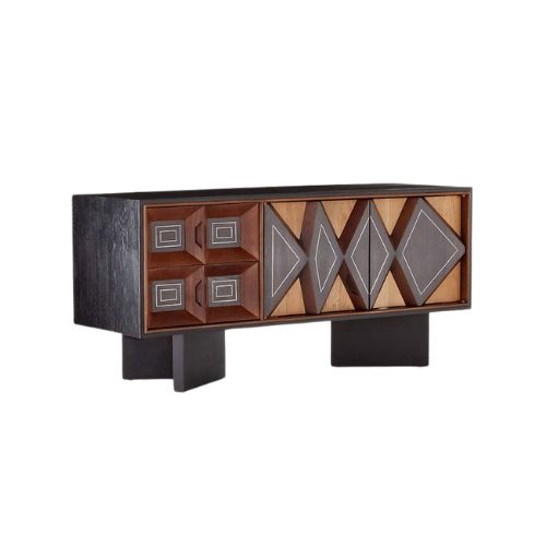 The Carved Wood Accent Cabinet is a sculptural storage piece that blends geometric artistry with practical functionality. Its doors feature intricately carved wood panels—possibly in diamond and square motifs—creating a textured surface that adds depth and rhythm. A two-tone finish, combining dark stained wood with lighter natural tones, enhances the visual contrast and modern appeal. The open back allows for seamless cable management and ventilation, making it ideal for styling with media components or decorative objects. Designed for contemporary interiors, this cabinet offers both aesthetic richness and everyday utility.