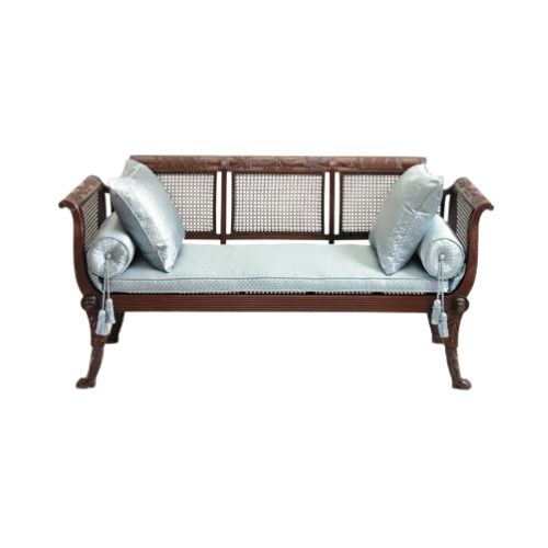 The Regency-Inspired Deewan Settee is a graceful blend of classical form and textural lightness. Its carved wooden frame, finished in a rich dark tone, anchors the silhouette with sculptural elegance, while the airy caned backrest introduces a sense of openness and refinement. The seat cushion is upholstered in soft light blue or grey silk or textured fabric, paired with matching square and round pillows adorned with tassels for a touch of decorative flair. Uniquely shaped legs complete the composition with historical rhythm. Designed for hallways, living rooms, bedrooms, or dining areas, this deewan offers timeless sophistication and versatile placement.