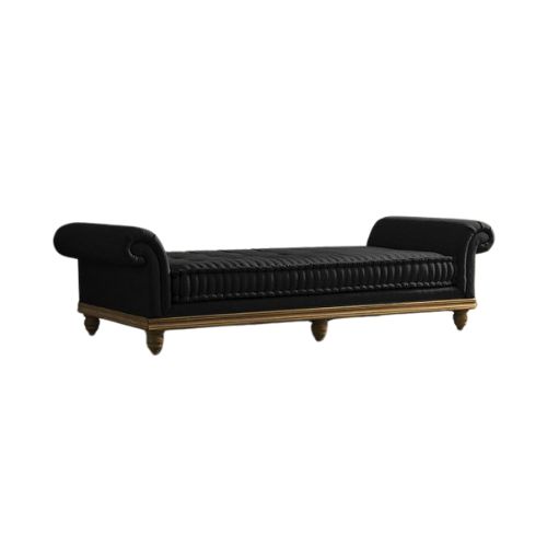 The Rita Backless Settee is a bold composition that channels opulence and sculptural drama. Upholstered in rich black leather, the seat features raised channel tufting that adds tailored texture and visual depth. Generously rolled arms introduce a sense of grandeur and comfort, while the dark wood base—accented with gold detailing—grounds the silhouette with warmth and ornamental richness. Turned legs complete the profile with classical elegance. Designed to command attention, this piece serves as a luxurious centerpiece for salons, dressing rooms, or curated interiors.