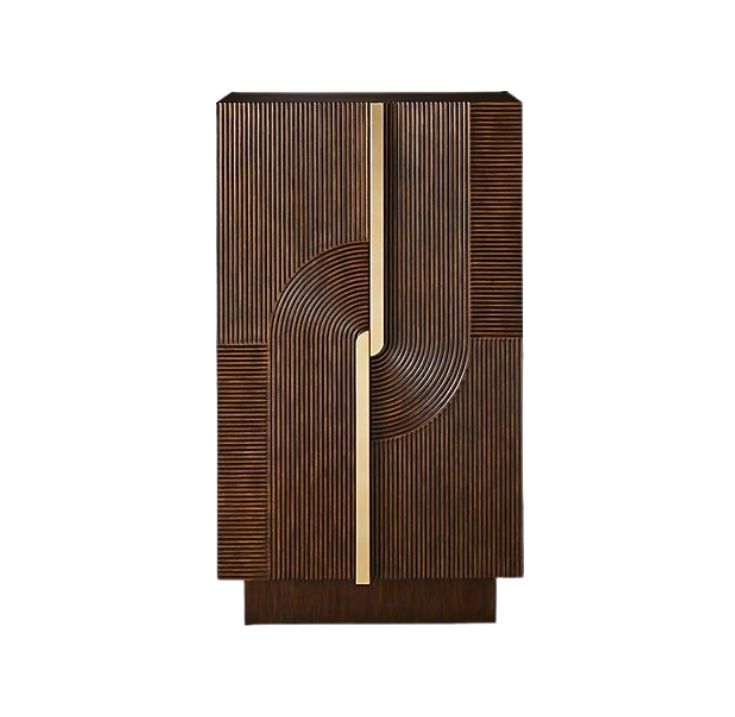 The Ritz Wardrobe by Jonathan Adler is a glamorous bar cabinet that elevates any entertaining space with its sculptural presence and luxurious detailing. Crafted from rich walnut or ebonized wood, the exterior features intricate geometric or sunburst motifs that reflect Art Deco elegance. Contrasting brass or gold inlay and hardware add luminous sophistication, while mirrored glass shelves and internal compartments provide refined storage for bottles, glassware, and bar tools. With its bold silhouette and curated materials, this piece serves as both a functional drinks cabinet and a statement focal point in living rooms, dining areas, or lounges.