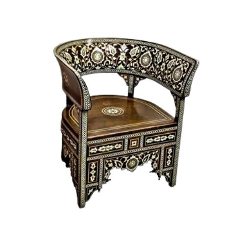 The Round Armchair is a luminous composition that celebrates heritage craftsmanship and sculptural elegance. Its curved silhouette—defined by a rounded back and sides—offers a graceful embrace, while intricate mother of pearl inlay forms delicate floral and geometric motifs across the frame. The rich dark wood finish provides tonal warmth and contrast, highlighting the iridescent inlay and handcrafted detailing. A plush upholstered seat adds comfort and softness, balancing the chair’s ornate structure with visual ease. With its expressive form and artisan character, this piece serves as a refined accent for salons, libraries, or curated interiors.