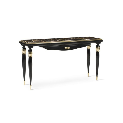 The Salda Deco Console Table is a refined statement piece that celebrates the bold elegance of Art Deco design. Its dark lacquered finish—suggesting black or deep brown—adds richness and depth, while gold accents on the legs, trim, and drawer pull introduce a touch of glamour. A patterned top featuring geometric or decorative motifs adds visual texture and sophistication. A single drawer provides discreet storage, and tapered legs with gold tips lend lightness and refinement. Designed for entryways, living rooms, or boutique-style interiors, this piece blends classic Italian craftsmanship with modern luxury.