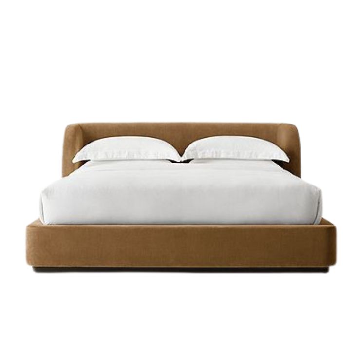 • Headboard: Gently curved, upholstered in caramel velvet